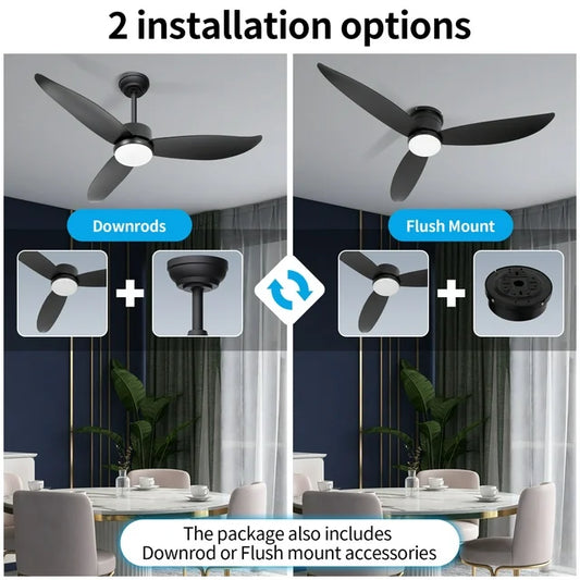 Wozzio 52'' Black Ceiling Fan with Light and Remote Control, 2 Options Installations, 3 ABS Fan Blades, Home
