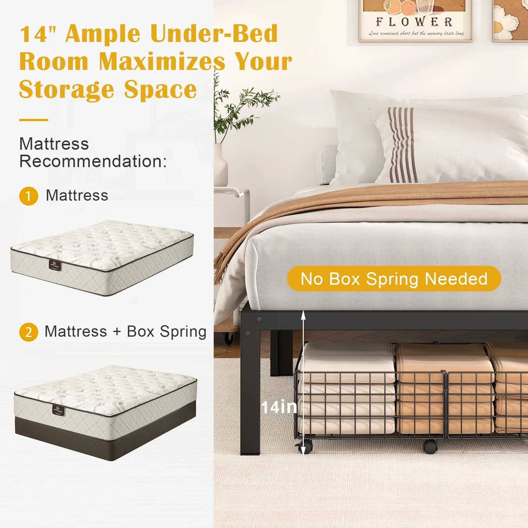 JOZ Queen Size Metal Platform Bed Frame with 14" Under Bed Storage, No Box Spring Needed, Black