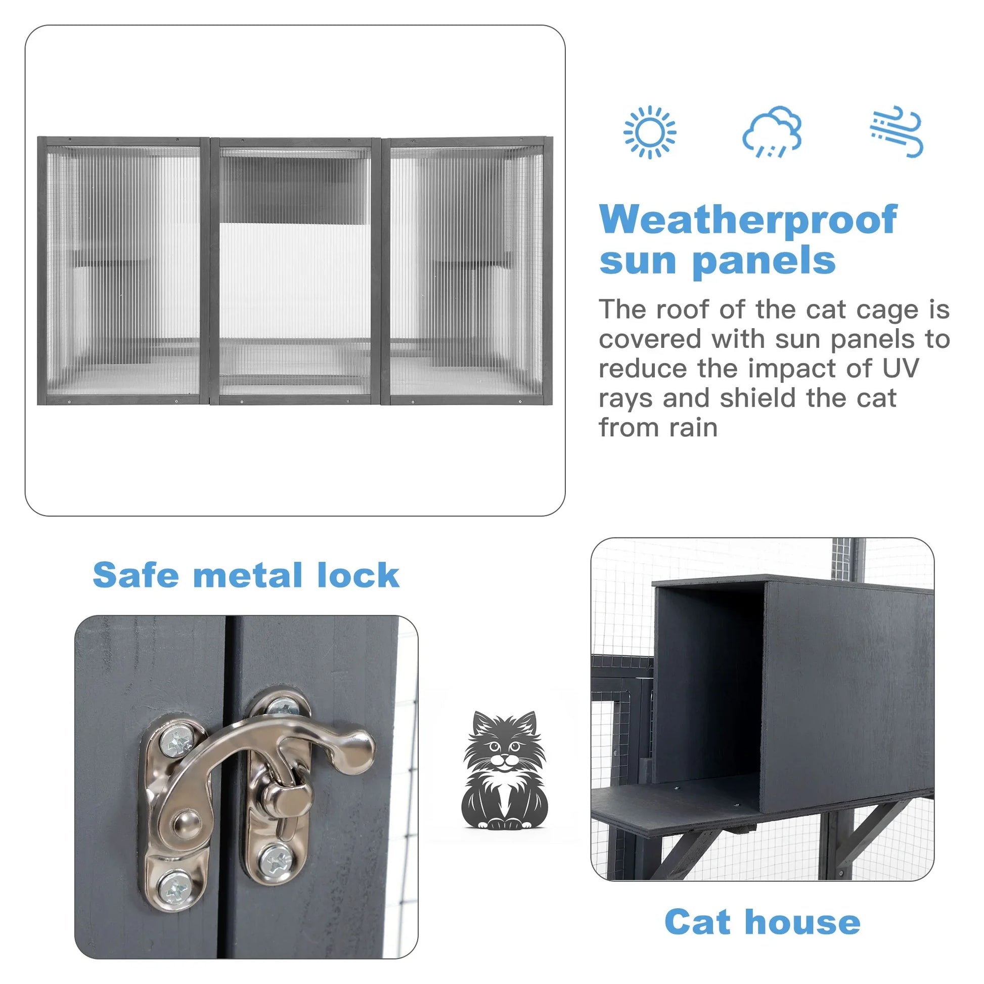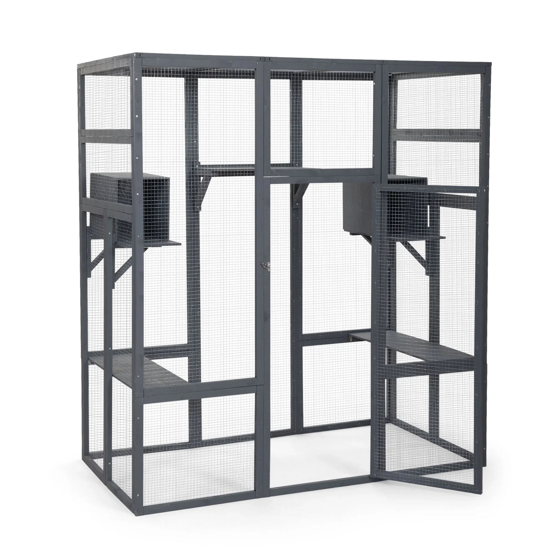Pefilos 70" Outdoor Cat House for Large Cats, Enclosure Wood Cat Cage with Platforms and Small House, Kitty Catio Condo Playpen, Gray