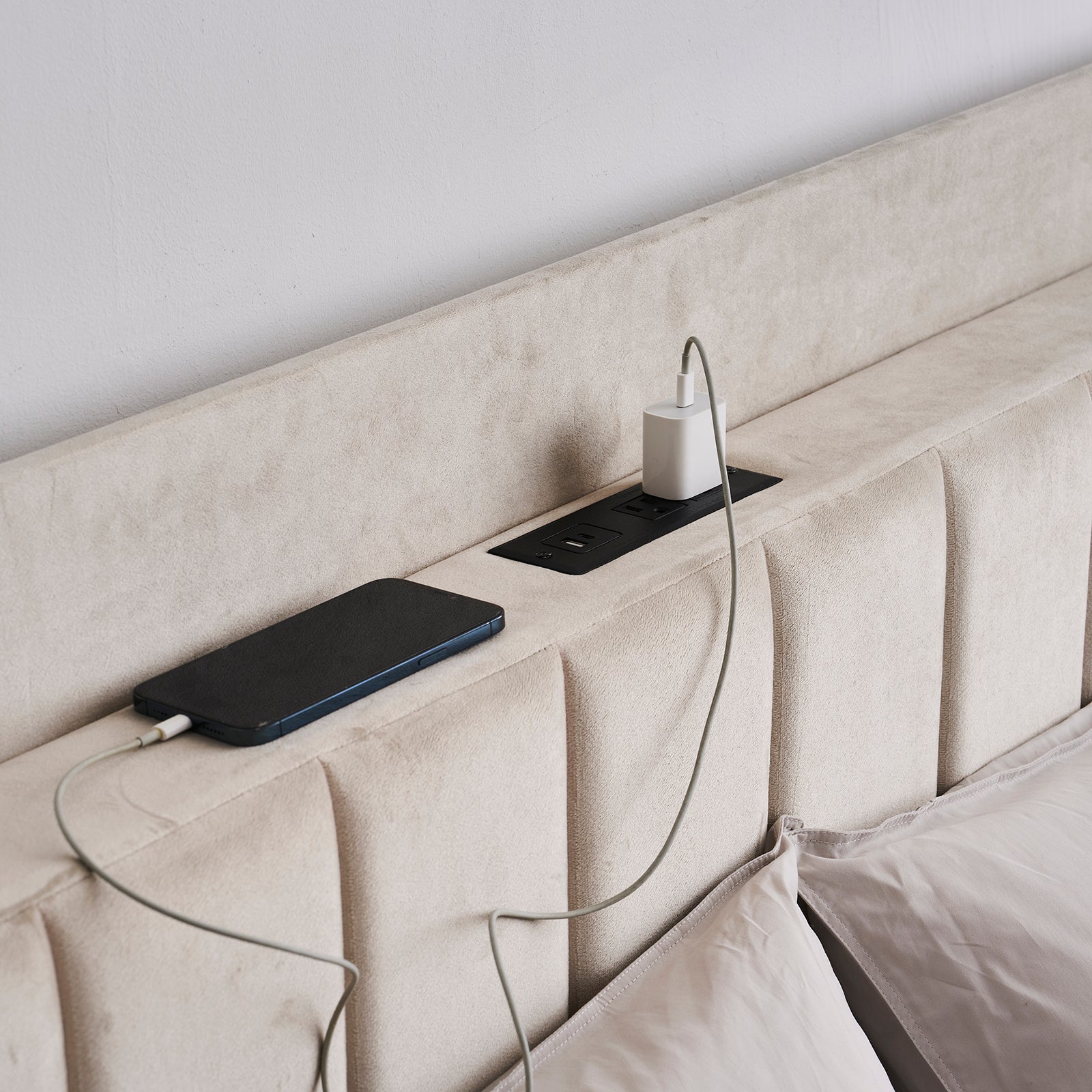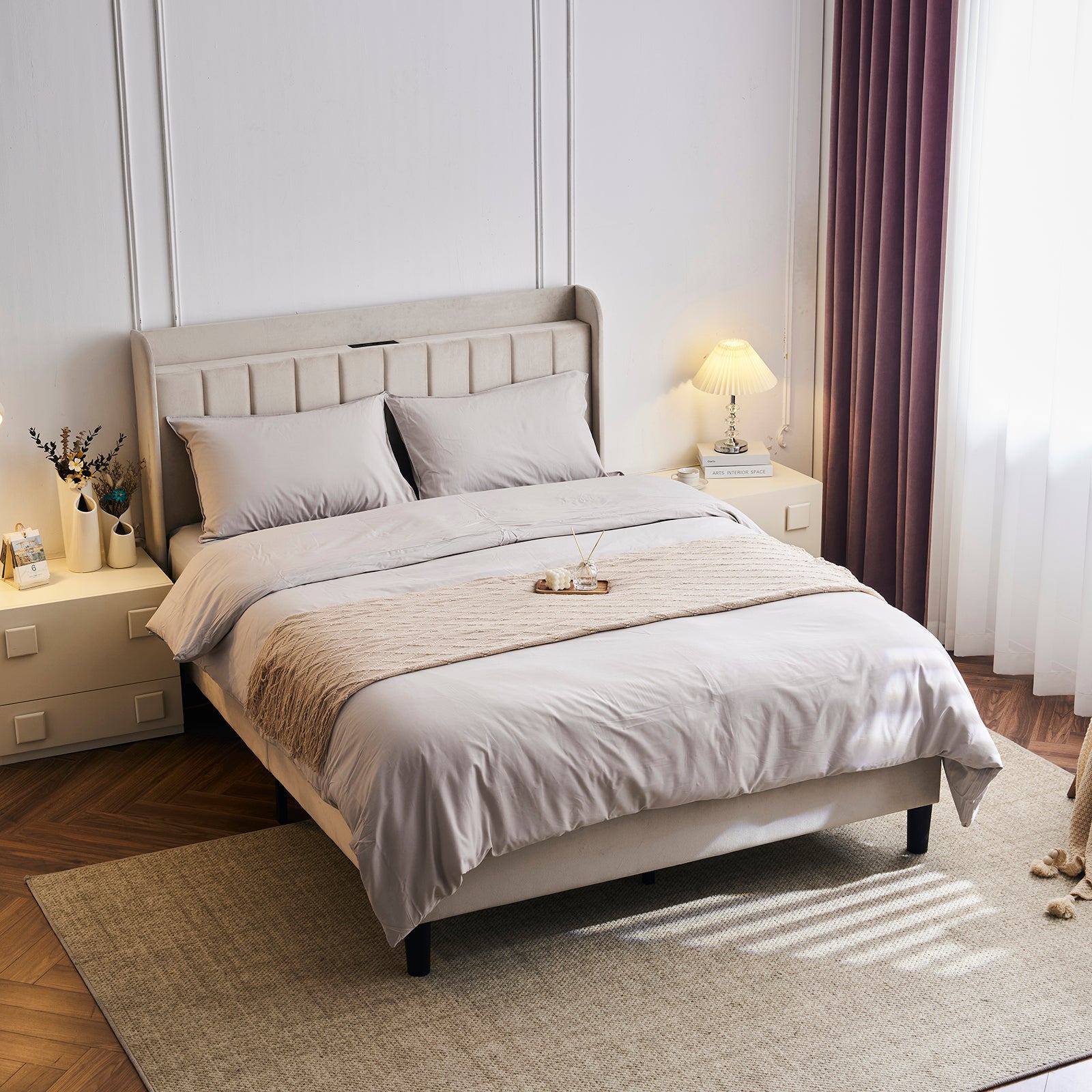Queen Bed Frame with Charging Station, Platform Bed Frame with Upholstered Headboard, Modern Deluxe Wingback, Wood Slat Support, Mattress Foundation, Beige
