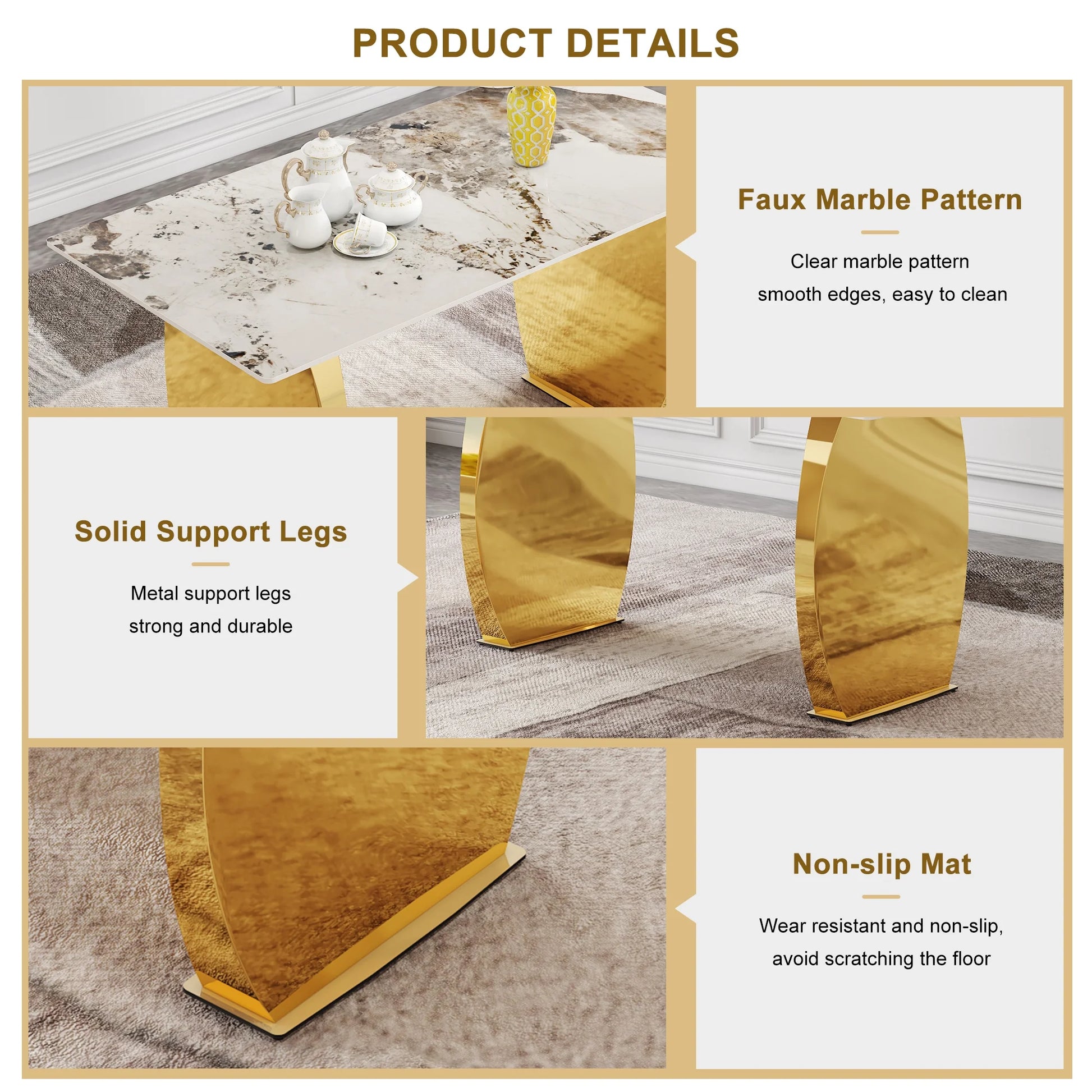Sumdeal 63 Modern Sintered Stone Dining Table with 6 Velvet Dining Chairs,White pattened Table with Golden Leg,6 Beige Chairs