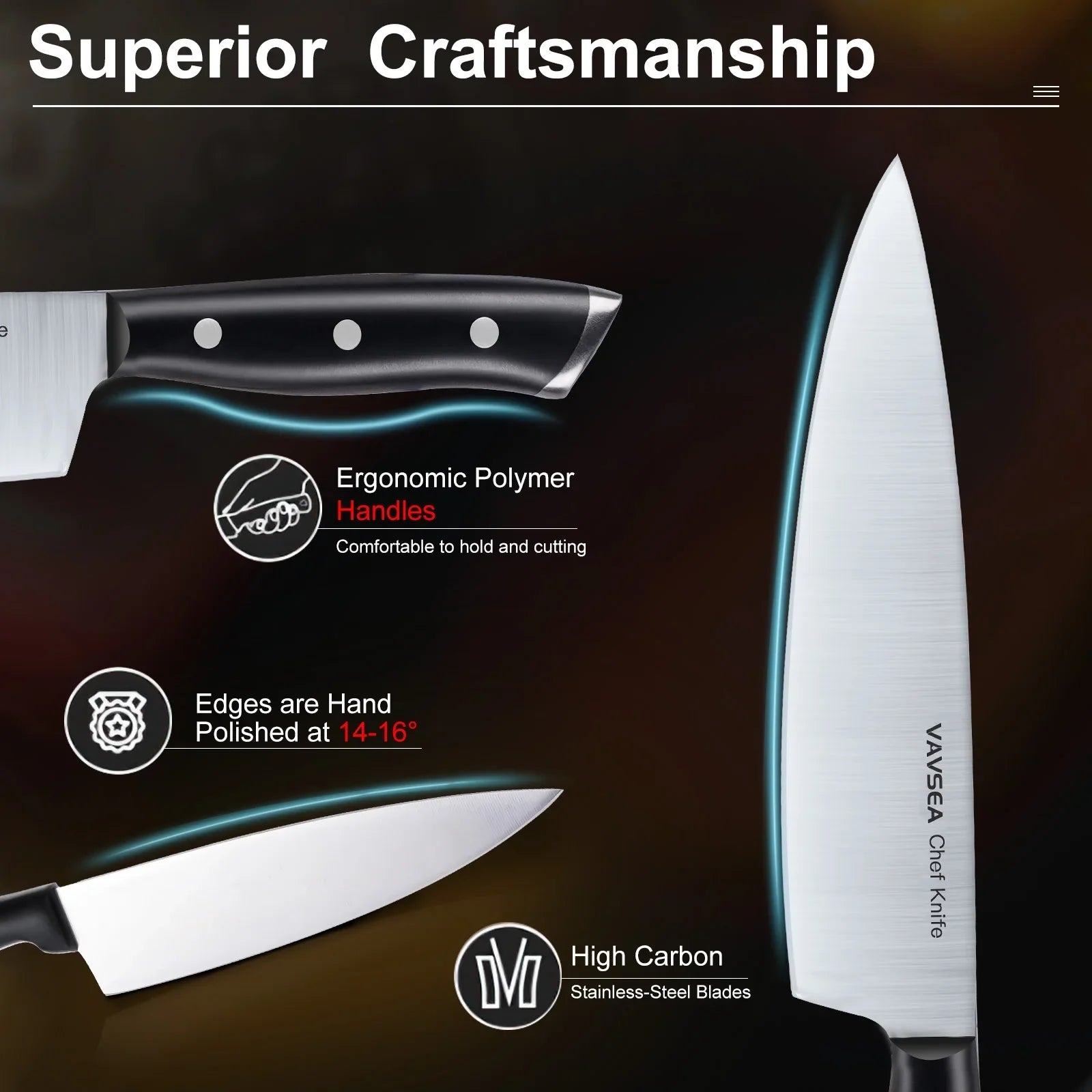 VAVSEA Kitchen Knife Set, German Knife Block Set with Sharpening Rod, 12Pcs Anti Rust Stainless Steel Knives Set, Dishwasher Safe, Black