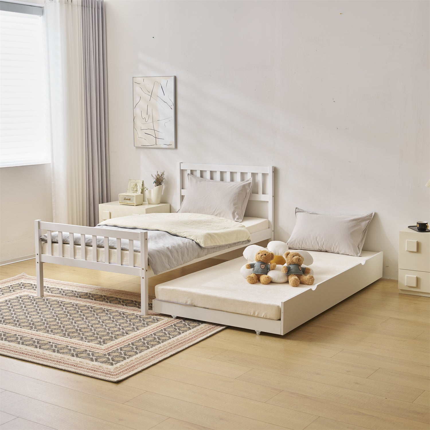 Zimtown Twin Bed with Trundle, Solid Wood Bed Frames with Headboard and Wooden Slats Support, Twin Trundle Bed Frame Roll Out, White